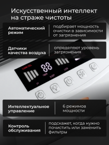 Дополнительное удобство при его использовании достигается благодаря наличию цветного индикатора качества воздуха, информативного дисплея и таймера. Присутствие очистителя в помещении практически незаметно, как благодаря его компактным размерам, так и благодаря минимальному издаваемому им уровню шума.