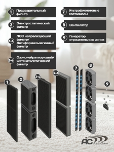Уникальность устройства заключается в восьмиступенчатой системе очистки, каждая их которых имеет многолетний ресурс и не требует замены через какой-либо промежуток времени! Воздухоочиститель снабжён четырьмя независимыми вентиляторами, что увеличивает его возможности по воздухообмену и, соответственно, обслуживаемой площади помещения. При максимальном потреблении 30 Вт, устройство способно очищать до 120 м2.