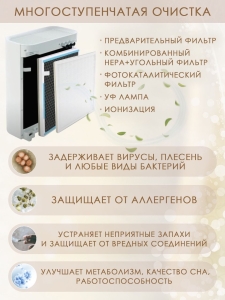 Улучшение качества воздуха в помещении происходит с помощью Вашего нового очистителя воздуха. Несколько уровней очистки включают в себя: предварительный фильтр, комбинированный HEPA+угольный фильтр, УФ лампу, фотокаталитический фильтр, ионизацию.